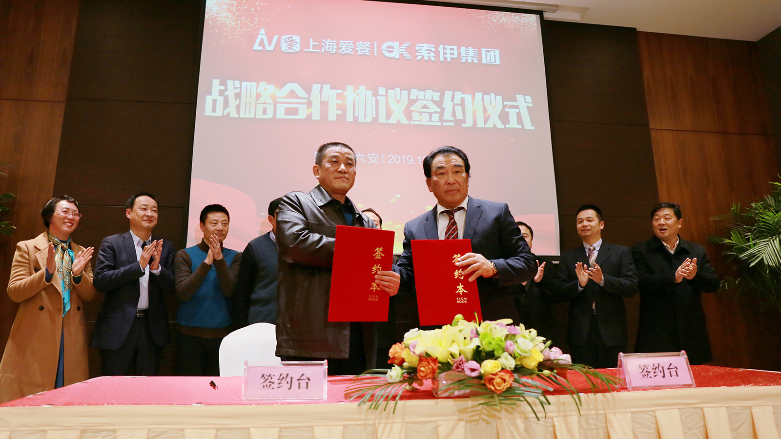 上海愛(ài)餐集團(tuán)與索伊集團(tuán)簽署戰(zhàn)略合作協(xié)議,六安市委書(shū)記葉露中、六安市人大常委會(huì)時(shí)任主任王勝、六安市開(kāi)發(fā)區(qū)主任盧俊、上海愛(ài)餐集團(tuán)董事長(zhǎng)何青、索伊集團(tuán)董事長(zhǎng)王瓊峰等領(lǐng)導(dǎo)出席簽約儀式。